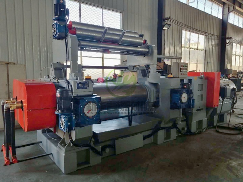 11、翻胶装置: 结构为自动式液压翻胶装置,采用变频器控制、无极变速、辊筒镀硬铬、油缸连接方式为内螺纹、时间继电器为数显式。