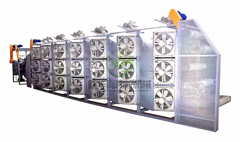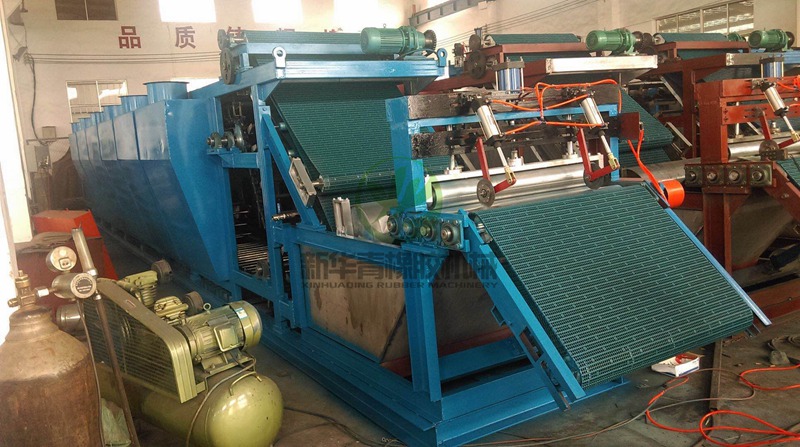 平铺式胶片冷却线主要适用于密炼机混炼、塑炼经开炼机压片或双螺杆挤出压片后的胶片冷却、叠片、收片。该线主要由主机、电控系统两大部分组成:主机含进料衔接段、粉水池段、冷却段及裁切段,电控系统整线采用PLC统一控制,可以实现无人操作,自动化程度高。